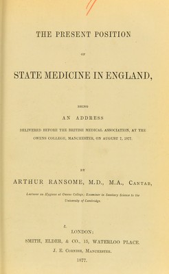 The present position of state medicine in England : being an address delivered before the British Medical Association at the Owens College, Manchester, on August 7, 1877 / by Arthur Ransome.