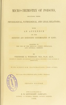 Micro-chemistry of poisons, including their physiological, pathological, and legal relations : with an appendix on the detection and microscopic discrimination of blood : adapted to the use of the medical jurist, physician, and general chemist / by Theodore G. Wormley.