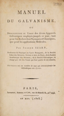 Manuel du galvanisme, ou description et usage des divers appareils galvaniques employés jusqu'à oe jour, tant pour les recherches physiques et chimiques, que pour les applications médicales / Par Joseph Izarn ... Ouvrage mis au nombre de ceux qui doivent former les bibliothèques des lycées.