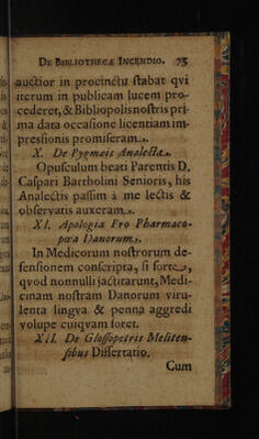Thomae Bartholini De bibliothecae incendio dissertatio ad filios / [Thomas Bartholin].