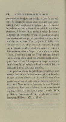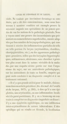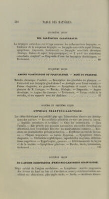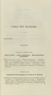 ![TABLE DES MATIÈRES AVAPiT-PROPOS LEÇONS ,•> PREMIÈRE ET DEUXIÈME LEÇON OBJET DU COURS. — IM&GE L&RTNGIENNE. — MODE OPÉRATOIRE. INSTRUMENTS. Objet et limites de ce cours. — Utilité du lai-yngoscopc. — Formation et analyse de l’image laryngée. — Procédé d’exploration, ses diriicullés : langue, luette, amygdales, épiglotte; spasmes. — Rliinoscopie. — Appa- reils laryngoscopiques : 1“ sources de lumière ; 2° laryngoscopes par ré- llexion et par rétraction ; 5® instruments d’exploration; 4° instruments de traitement 1 TROISIÈME LEÇON CLASSIFICATION DES MALADIES DU LARYNX ET DU PHARYNX. Classifications anatomiques, anatomo-pathologiques et nosologiques.— Exposé et critique de la classification du professeur Lasègue — Classification de l’auteur : Angines simples ou locales (aiguës, catarrhales, toxiques, etc.]; angines localisées ou secondaires (inflammatoires, spécifiques, diathési- ques); tumeui's, névroses. . ; . . . 45](https://iiif.wellcomecollection.org/image/b21701994_0437.jp2/full/800%2C/0/default.jpg)