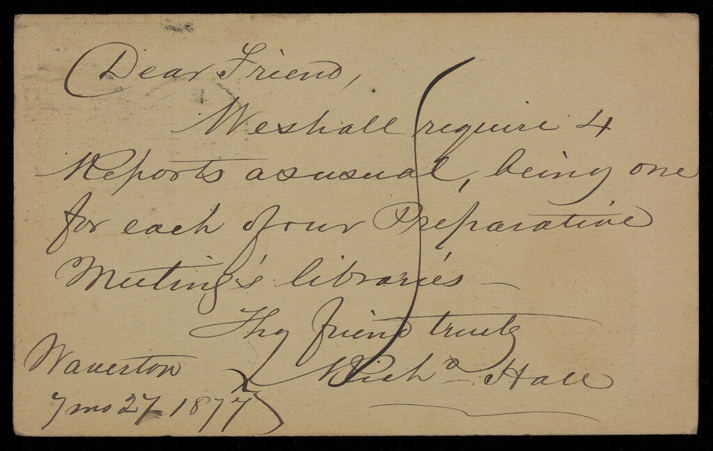Credit: Postcards from various Monthly meetings around the country specifying how many Retreat Reports will be required. Source: Wellcome Collection.