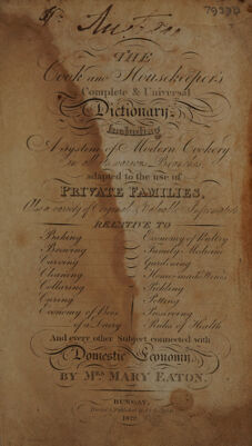 The cook and housekeeper's complete and universal dictionary; including a system of modern cookery. In all its various branches, adapted to the use of private families : also a variety of original and valuable information, relative to baking, brewing, carving ... and every other subject connected with domestic economy / by Mary Eaton.