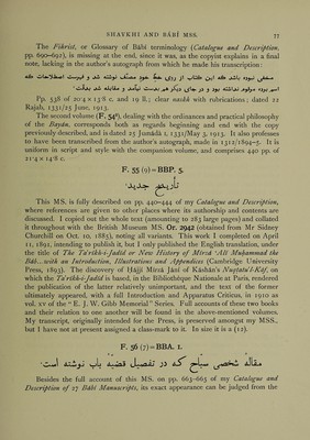 A descriptive catalogue of the Oriental mss. belonging to the late E. G. Browne / by Edward G. Browne, completed & edited with a memoir of the author and a bibliography of his writings by Reynold A. Nicholson.