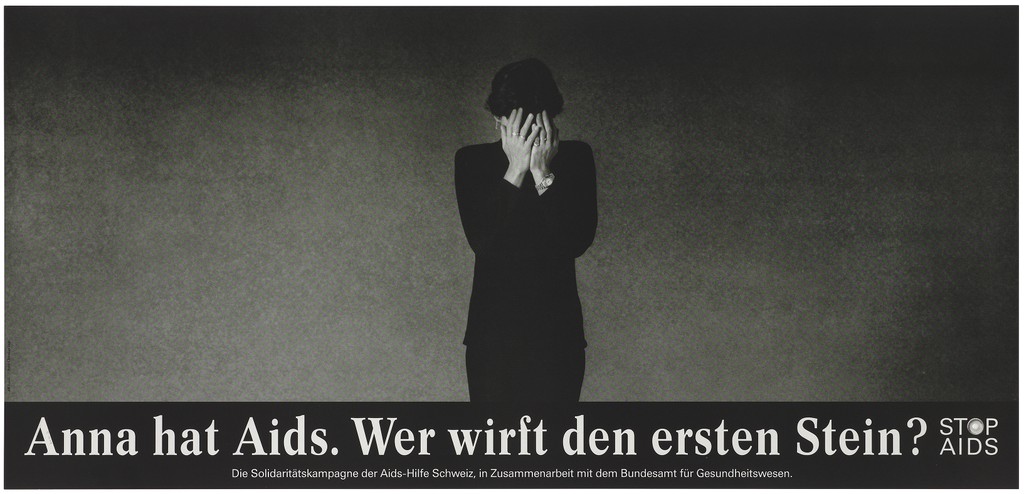 Credit: A woman burying her face in her hands with the message in German: "Anna has AIDS. Who throws the first stone ?". Colour lithograph. Lithograph by Christian Vogt. Source: Wellcome Collection.