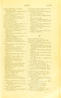 ![Special Expenses—continued. precepts for, 230 r. Labouring Classes Lodging-Houses Acts, XVI. 1. Allotments Act, 1887, XX. 10. Square, definition, 4. Staircases] bye-laws, XXIX. 23 u. Stallages, may be taken, 166 u. regulations, 167 u. Statues, XXIX. 42 u. Statutes : See Acts. Steam Engines, smoke nuisance, 91. Stock, issue of, XXIX. 52. Stone Quarry, fencing of, XVIII. 4. Stream, definition, II. 20. sewage to be purified before being discharged into stream, 17. offensive, 48. fouling of, by gas-washings, &c., 68, 169, II. 2-5. putting solid refuse, &c., into, II. 2, XXIX. 47, XXXV. 1. putting noxious liquids, II. 4. putting matter from mines, II. 5. proceedings for interfering with, II. 8. Streets, definition of, 4, XXXI. 29, XXXIV. 5. adoption of, 152 u, XXIX. 41 u. vest in urban authority, 149 u. paving &c., of private, 150 u. private may be declared highway, 152 u. line of buildings in, 155 u., 156 u., XXL 3 u. cellars, &c., under, XXIX. 35 u. cleansing of, 42 u., 44 u. gas and water pipes in, 153 u. making, 154 u., XXIX. 23 u. watering, 42. fire plugs, &c., to be marked in, 66 U. naming and numbering of, 160 u. improving, &c., 160 U., XXXIV. lighting of, 161 u. line of, 160 u. obstructions, &c.,in, 160 u., 171 u. notice to sewer private, Sch. IV. refuges in, XXIX. 39 u. trees, &c., in, 149 u. unhealthy, XXXI. 4 u. making sewer across, 16, 32. Summary Jurisdiction, definition, 4- Summary Proceedings : See Pro- ceedings. Summoning Officer, Sch. II., If 32 u., Sch. III. Summons : See Proceedings. form of, Sch. IV. Sunday, provision as to, in election, Sch. II., IT 66 u. Support (for sewer), definition, VII. 2. Surveying Lands, 305. Surveyors’ report as to carrying sewer through lands, 16. as to drains required, 23. want of privy, &c., accommodation, 36. ditto in factories, 38. entry by, to examine drains, &c., 41. report as to house without water- supply, 62. may act as surveyor of highways in urban district, 144 u. estimate by, before contract, 174 u. appointment of, 189 u. definition, 4. swings, &c., bye-laws, XXIX. 38 u. definition, XXXIV. 5. T. Tallow-melter, 112 u. Taxation of solicitors’ bills, 249. Telegraphs, XXIX. 13 u. Tenant, liability as to costs of abating nuisance, &c., 104. may deduct proportion of private im- provement expenses paid by him, 214, 240. agreements with landlord, saving of, 226 u. instalments may be deducted from rent by, 257. division of rates between landlord and, 320. preventing landlord obeying Act, &c., 306. of allotments, XX. 6, 7. Tent, within provision of sec. 91 P. PI. Act, 1875, XVI. 9. infectious disease in, XXIV. 13. Thames Conservancy and Navi- gation, saving clause, II. 18. Theatre, ingress and egress, XXIX. 36 u. Tidal Waters, definition, II. 20. Tithes, rateability of, 211 u., 230 R. Tolls, market, 166 u., 167 u. turnpike, 148 U. Towns Improvement Clauses Act, 1847, incorporation of sections, 160 u., 169 u. Towns Tolice Clauses Act, 1847, incorporation of, 171 U. Trades, offensive, 112-115 u. Transfer of mortgage, 238. register of, 238. form of, 238, and Sch. IV. Treasurer, appointment of, 189 u. remuneration of, 190 r. d](https://iiif.wellcomecollection.org/image/b24916651_0037.jp2/full/800%2C/0/default.jpg)