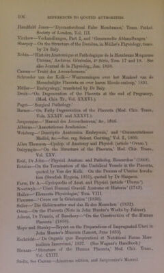 ![1 10 Nerves in gravid uterus, 85. Omphalo—mesenteric vessels, 45. Ovulation, phenomena of, 7. Ovum; its transit through Fallopian tube, 8; where united with semen of male, 9; position of its attachment to uterus, 22. Ovum, apoplectic ; its nature, 28. Os uteri, modified by pregnancy, 86. Parturition ; Dr Simpson’s suggestion of its determining cause, 27. Peritoneal coat of uterus ; changes during pregnancy, 84 ; extent diminished after labour, 103. Placenta ; its function, 46-59 ; its form in lower animals, 46 ; in man, 46; its weight and dimensions, 46 ; general con- figuration, 47 ; foetal pwrtion of, 48 ; maternal portion of, 53 ; peripheral dis- tribution of umbilical arteries in, 50 ; arrangement of maternal vessels in, 55- 64 ; its cavernous structure, 57 ; its early development, 22-62 ; situation of, 67 ; anomalies in its insertion, 69 ; anomalies in its form, 69 ; exhibits signs of degeneration towards end of preg- nancy, 70 ; William Hunter’s investiga- tions on, 55 ; Dr Reid’s, 56 ; Schroeder van der Kolk’s, 56. Placenta previa; anatomical conditions producing, 66. Placental bruit or souffle; how produced, 68. Placental circulation; discovered by the Hunters, 55. Placental spot, condition of, after delivery, 96 ; reproduction of mucous membrane over, 100. Post-partum hremorrhage ; how provided against, 66. Prolapse of funis; measures adopted for, | 78. Puerperal and surgical patients, analogy between, 94. Reid, Dr, on the placenta, 56. Round ligaments, supposed purpose of, 83. Secundines, definition of, 46. Sharpey’s researches on decidua of the bitch, 23. Schroeder van der Kolk on the placenta, 56. Sub-involution of uterus, 103. Super-involution of uterus, 104. in early weeks, 71; at a later period, 73 arrangement of umbilical vessels in, 73 knots on, 75; coiling of, round child, 75 its effects, 76; lymphatics in, 76 anomalies in structure, 78 ; prolapse of, 78 ; separation of, after birth, 79. Umbilici arteries; their ultimate distribu- tion in placenta, 50. Umbilical vein, without valves, 73. Umbilical vesicle ; its form and relations, 44 ; analogous to yolk-sack, 45. Umbilical vessels; cause of their spiral arrangement, 74 ; vital contractions of, 74; obstructions of, 78; their first appearance in allantois, 43. Umbilicus (of Coste) in decidua ovuli, 25. Urachus ; its origin, 43. Uterine follicle^ imbedded in walls at the end of gestation, 99. Uterine hsemorrhage during pregnancy from separation of placenta, 65. Uterine vessels; their development during pregnancy, 84; their continuation into placenta, 65. Uterus, preparation of, for reception of ovum, 9 ; condition of, after delivery, 93 ; fatty degeneration of, after deliv- ery, 101; sub-involution of, 103; super- involution of, 104. Uterus, unimpregnated ; structure of, 81 ; a contractile organ, 83. Uterus, gravid, structure of, middle coat of, 81; arrangement of; its muscular fibres, 81 ; changes in its peritoneal coat, 84 ; relations of ligaments to, 90 ; develoj)- ment of blood-vessels in, 84; of lym- phatics, 85; of nerves, 85 ; shape of, 90; direction of axis, 91 ; relations of, 90 ; its rate of increase, 89 ; lateral inclination of, 92 ; reproduction of its mucous membrane, 98. Unavoidable haemorrhage, conditions pro- ducing, 67. Vesicular mole; its nature, 34 ; can it occur without impregnation ? 37. Vessels, uterine, diminution in size of, after delivery, 103. I Villi of chorion, development of, 30 ; rela- I tion of, to decidua, 23 ; their perma- I nence throughout gestation, 32 ; mode of ] growth, 33. I Villi of placenta; Mr Qoodsir’s view of their structure, 60. Umbilical cord, 71 ; of what constituted ‘Wharton’s gelatin,’ 76. Edinburgh : Printed by fJRANX Urotiiers, 14 St .Tames’ Stjuar.’.](https://iiif.wellcomecollection.org/image/b22334452_0116.jp2/full/800%2C/0/default.jpg)
