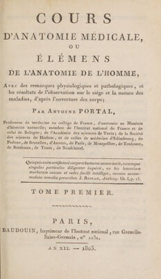 Cours d'anatomie médicale; ou, Elémens de l'anatomie de l'homme, avec des remarques physiologiques et pathologiques, et les résultats de l'observation sur le siège et la nature des maladies, d'après l'ouverture des corps / [Antoine Portal].