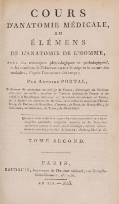 Cours d'anatomie médicale; ou, Elémens de l'anatomie de l'homme, avec des remarques physiologiques et pathologiques, et les résultats de l'observation sur le siège et la nature des maladies, d'après l'ouverture des corps / [Antoine Portal].