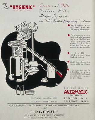 Credit: A machine for filling bottles or tubes with pills, tablets etc.; advertising Richard Brandt's "Hygienic" machine. Process print after Leonhard Fries. Source: Wellcome Collection.