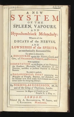 Credit: A new system of the spleen, vapours, and hypochondriack melancholy wherein all the decays of the nerves, and lownesses of the spirits, are mechanically accounted for. To which is subjoined, a discourse upon the nature, cause, and cure, of melancholy, madness, and lunacy. With a particular dissertation on the origine of the passions; the structure, etc. of the nerves ... To which is prefix'd a philosophical essay concerning the principles of thought / [Nicholas Robinson]. Source: Wellcome Collection.