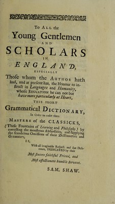 Credit: A grammatical dictionary, containing the heteroclites of the Latin tongue ... in which the gross mistakes of our dictionaries in the names of diseases, drugs, and plants, are corrected ... / With an appendix, containing observations upon some passages in Horace ... In a letter to ... Dr. Freind. Source: Wellcome Collection.