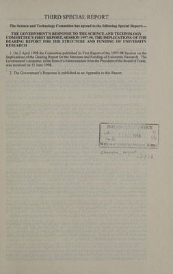The Government's response to the Science and Technology Committee's first report, Session 1997-98 : The implications of the Dearing Report for the structure and funding of university research third special report / Science and Technology Committee.