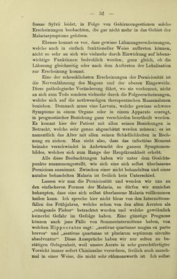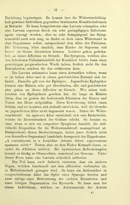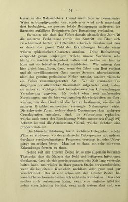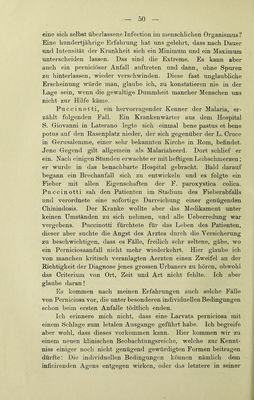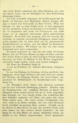 ![Je mehr sich ein Paroxysmus ausdehnt, ohne wahrnehmbare Erhebungen und Remissionen darzubieten, desto deutlicher tritt der Typus subintrans auf, desto w'eniger ist das Fieber zu fürchten, desto sicherer darf man auf das Aufhören desselben durch eine lang ausgedehnten Paroxymus rechnen. AiTch die Malaria hat ihre Febricula, ohne deshalb eine deut- hche Cachexie darzubieten. Es kann aber zu einer solchen kommen, entsprechend den Factoren des Fiebers (inficirendes Moment, individuelles Moment), besonders dann, wenn Chinin- präparate entweder nicht gereicht werden oder nicht zur Wirkung «■elaneen. o o Je deutlicher die Febricula auftritt, einen desto hartnäckigeren Verlauf rdnunt sie. Die Febricula verläuft manchmal derart, dass sie schliesslich einem Fieber en miniature gleicht. Ich habe Fälle beobachtet, deren Dauer sich nur auf 2—3 Stunden reducirte. Die Febricula schliesst sich, wenn sie so auftritt, gewöhnlich den Mahlzeiten an. Sie verläuft mit den drei Stadien: Frost, Hitze und Schweiss, welche im Verlaufe eines einzigen Spazier- ganges verschwinden können. Diese Tliatsache ruft den Einfluss der äusseren Temperatur, auf den hn Verdauungsstadium sich beflndlichen Menschen ins Gedächtniss. Im Winter entsteht ein Kältegefühl, und es folgt dann das Verdauuugsflebe]-; im Sommer kommt zuerst eine Erweiterung der Blutgefässe und ein leich- teres Schwitzen zu Stande. Diese letzterwälinten Thatsachen bilden einen Uebergang von den physiologischen zu den pathologischen Erscheinungen und Anden ihre Erklärung in der veränderten Blutmenge der Milz und in dem Einfluss, welchen das durch die langsam und schwach wirkende Malaria veränderte Blut auf die Chymus- bildung und auf den Eintritt der verarbeiteten Stoße in die Cir- culation ausübt. Das Wesentliche besteht in Folgendem: So oft eine physio- logische Funktion, wie z. B. die Verdauung sich wiederholt, so steigert sich der Gefässorgasmus und zwar nicht bloss derart, dass die Kraft und Frequenz der Bewegung zunimmt, sondern auch dass eine Art ganz leichtes Fieber mit seinen drei Stadien beobachtet wird. Nachdem wir nun das Minimum und das Maximum der Malaria in ihrer Ursache und Wiikung kennen gelernt haben, legen wir uns nun die Frage zur Beantwortung vor, wie veiläuft Eaccelli, Malaria, 4](https://iiif.wellcomecollection.org/image/b21978141_0055.jp2/full/800%2C/0/default.jpg)