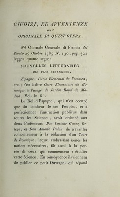 Corso elementare teorico di botanica, ed introduzione alla parte pratica. Per l'ammaestramento che si fa nel R. Giardino di Madrid, d'ordine di S. M. Cattolica / opera del dottore D. Casimiro Gómez Ortega ; [traduttore Giambatista Guatteri] Traduzione dallo spagnuolo.