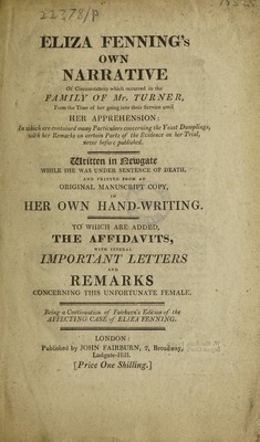 Eliza Fenning's own narrative of circumstances which occurred in the family of Mr. Turner, from the time of her going into their service until her apprehension ... To which are added, the affidavits, with several important letters and remarks / [Elizabeth Fenning].
