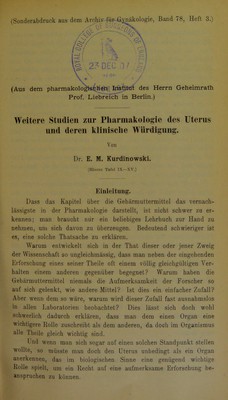 Weitere Studien zur Pharmakologie des Uterus und deren klinische Würdigung / von E.M. Kurdinowski.