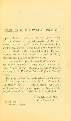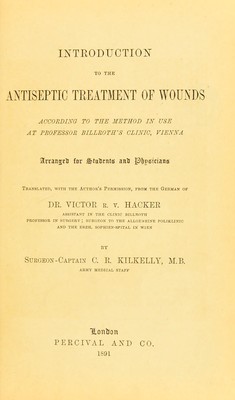Introduction to the antiseptic treatment of wounds : according to the method in use at Professor Billroth's clinic, Vienna / translated, with the author's permission, from the German of Victor R.V. Hacker ; by C.R. Kilkelly.
