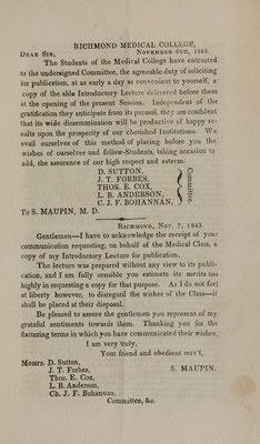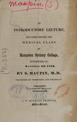 An introductory lecture : delivered before the medical class of Hampden Sydney College, Richmond, Va., October 30, 1843 / by S. Maupin.