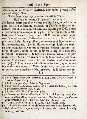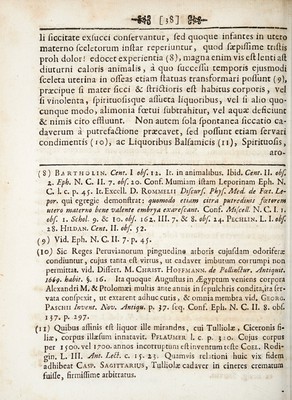 ![• . [?§] __ li Siccitate exfucci conservantur, Sed quoque infantes in utero materno Sceletorum infiar reperiuntur, quod farpifiime triftis proli dolor! edocet experientia (8), magna enim vis e Alenti aft diuturni caloris animalis, a quo SucceSfu temporis ejusmodi fceleta uterina in ofleas etiam flatuas transformari pofliint (9), pnecipue fl mater flcci & Aridioris eA habitus corporis, vel fi vinolenta, fpirituofisque aflueta liquoribus, vel fi also quo¬ cunque modo, alimonia fcctui Subtrahitur, vel aquae deficiunt & nimis cito effluunt. Non autem Sola Spontanea Siccatio ca¬ daverum a putrefa&ione praecavet, Sed poSTunt etiam Servari condimentis (10), ac Liquoribus BalSamicis (11), Spirituofis, aro- (8) B^Rtholin. Cent. I obf. 11. It. in animalibus. Ibid. Cent. II. obf. Z. Epb. N. C. II. 7. obf. 20. Conf. Mumiam iftam Leporinam Eph. N. C. 1. c. p. 45. It. Excell. D. Rommelii Dtfcurf. Pkyf. Med. de Poet. Le¬ por. qui egregie demonftrat: quomodo etiam citra putredinis faetorem utero materno bene valente embrya exarefcant. Conf. Aiifcell. N. C. I. r. obf. 1. Schol. 9. & io. obj. 16z. III. 7. & 8. obf. 24. Pechlin. L. I. obf. 28. Hildan. Cent. II. obf. 52. 19) Vid. Eph. N. C. II. 7* P« 45* (ioj Sic Reges Peruvianorum pinguedina arboris cujufdam odorifera condiuntur, cujus tanta eft virtus, ut cadaver imbutum corrumpi non permittat, vid. Differt. M. Christ. Hoffmann. de Pcllinftur. slntiquit, 1669. habit. §. 16. Ita quoque Auguftus in dEgyptum veniens corpora Alexandri M. & Ptolomaei multis ante antiis infepulchris condita,ita fer- vata confpexit, ut extarent adhuc cutis, & omnia membra vid. Georg. Paschii Invcnt. Nov. slntiqu. p. $7. Seq. Conf. Eph. N. C. II. 8. obf. 137. P- 297- (11) Quibus affinis eft liquor ille mirandos, cui Tulliolae , Ciceronis fi¬ liae, corpus illaefum innatavit. PflaUmer 1. c. p. 3(0. Cujus corpus per 1500. vel 1700. annos incorruptum eft inventum tefte Coel. Rodi- gin. L. III. Ant. Le&. c. 13. 23. Quamvis relationi huic vix fidem adhibeat Case. Sagittarius, Tulliola; cadaver in cineres crematum fuifle, firmiffime arbitratus.](https://iiif.wellcomecollection.org/image/b30773593_0042.jp2/full/800%2C/0/default.jpg)
