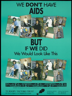 People of New Zealand repeated below with a message that people look no different when they have AIDS; advertisement by the Te Roopu Tautoko Trust. Colour lithograph.
