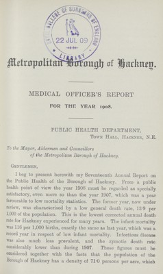 Report on the sanitary condition of the Hackney District for the year 1908.