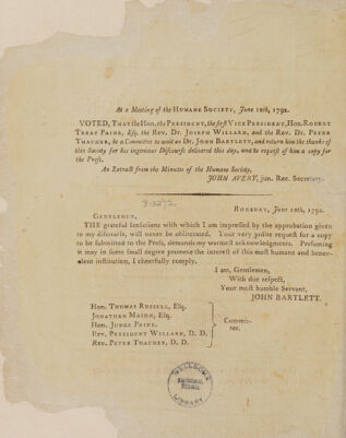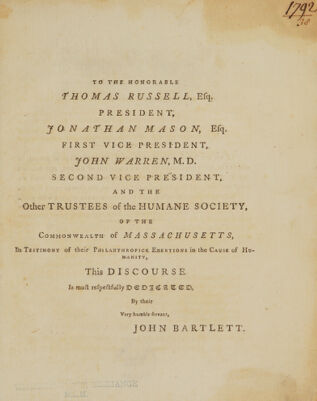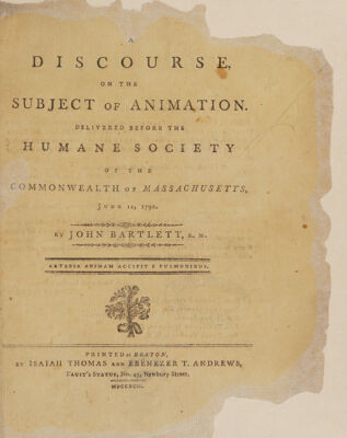 A discourse on the subject of animation. Delivered before the Humane Society of the Commonwealth of Massachusetts, June 11, 1792 / [John Bartlett].