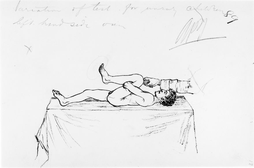 Credit: M0019192: Illustration showing Thomas's test for disease of the hip for use with children. Source: Wellcome Collection.
