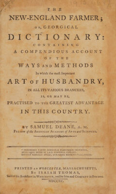 The New England farmer; or, Georgical dictionary: containing a compendious account of the ways and methods in which the most important art of husbandry. In all its various branches, is, or may be, practised to the greatest advantage in this country / By Samuel Deane, A.M. Fellow of the American Academy of Arts and Sciences.