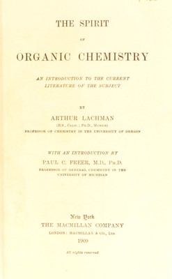 The spirit of organic chemistry : an introduction to the current literature of the subject / by Arthur Lachman; with an introduction by Paul C. Freer.