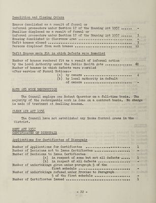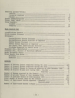 ![Sanitary Accommodations- Schools .......... 4 Licenced Premises .. 2 Houses ...40 Septic Tanks/Cesspools ..... .. 22 Tents, Vans, Sheds .!!!!!!!!!!!!!!!!!! 4 Water Supply ;- General ....-. sampling.!!!!!!!!!!!!!!!!!!! 29 Work Carried Out Accumulations Removed ........ ^ Ditch-courses Cleansed .]*’*’* 2 Drainage: - Drains/Privato Sewers Cleansed . n Drains/Private Sewers Repaired or Improved... 2 Public Sewers Cleansed . 21 Public Sewers Repaired or Improved ..... 1 New Septic Tank Installations Provided .!!!!!.*!! 2 Premises Connected to Public sewer . 2 Premises etc., Disinfected . !..!!!! 2 Premises etc., Cleared of Furniture Effects ..... 4 Smoke Nuisances Abated .. Water Supply from Mains ... Provided ........ Restored .... HOUSING Number of Private Houses completed during the year . 227 Number of Council Houses completed during the year .. 90 Number of Council Houses in course of erection at 31st December 1965 . 24 Number of Council Houses sold during I964 - Pre-War . 4 Post-War . 5 Number of Houses acquired by the Council . Number of pre-war Houses at 31st December 1964 ...* * 210 Dumber of post-war Houses at 31st December 1964..... 823 Total number of Houses owned by the Council .. * 1033 Number of Improvement Grants approved - Standard .... 13 Discretionary ..... 43 Number of Improvement Grants refused ..... 5](https://iiif.wellcomecollection.org/image/b29779765_0025.jp2/full/800%2C/0/default.jpg)