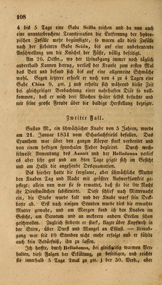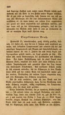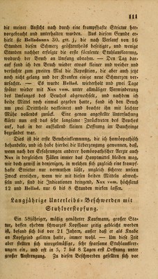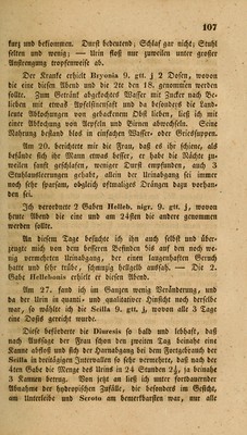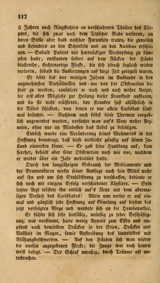 ![5 Sa&ren nocf> iföittgfled)fen an t>erfd)iebenen feilen be$.S6r* perS, bk ftd) $war nad) bem £epli§er §Sabe verloren, an bften ©fette aber balb nad)l)er gurunfeln traten, bie juweilen unb befonber£ an ben ©d)enfeln unb an ben Natibus erfd>tc* nen. — ©obalb tyatitnt mit l)artnäcfrger £>er(topfung $u fam* pfen Ijatte, entffanben fofort auf bem Mcfcn ber £anbe bla§rotl)e, Ped)fenartige glecfe, bte fiel) jebod) foglcid) lieber verloren, fobalb bie Ausleerungen auf furje $eit gewgelt waren. (£r lebte hiß fcor wenigen 3af)ren im 2JuSlanbe in ben angenef)m|?en 2>err)altnif]Ten unb. um t>on ber £)bf?ruction be* freit $u werben, confulirfe er nad) unb nad) mel)re ÜIer$te, bte erff alfeö SDioglidje $ur Teilung biefer $ranff>eit aufboten, unb ba fte nid)t reufftrfen, ben $ranfen faf? aCf|a^rrtcf> in bie £>aber fdjicften, fcon benen er nur aöein @arl£bab fünf* mal befuctyfe. — 3?ad)b?m and) felbß biefe Xbcrmen fcergeb* lid) angewenbet worben, t>erfud)te man aufS 3?eue meiere 2lr$* neien, or)ne nur im 9Diinbef?en ba$ Uebel ju beTeitigem €nblid) würbe eine SSeranberung feinet 2Bol)norfeS in ber Hoffnung beantragt, ba$ biefe fcielleidjt gunffig auf feinen 3«* tfanb einwirken fonne. — <£r gab feine ^anblung auf, hm j)ierf)er, behielt aber feine Obflrucfion nad; vok fcor, nad)bem er wieber über ein Sfafjr mebicinirt bafte. £)urd) ben langjährigen ®ebraud) ber $?ebicamenfe unb ber 35runnenfuren wirfte feiner ÜJuSfage nad) fein Mittel mel)r auf tfm unb um ftd) ©tubloffhung $u i>erfd)affen, Ubimtt er ftd) nod> mit einigem €rfolg &erfd)iebener $lt)|Kere. — ©ein fester 5Jr$t troflete tr)n enblid) auf'3 3tfeue mit bem aberma* (igen SSerfud) be£ (EarlöbabeS! Slflein nun fcerlor er auf ein* mal unb ganjlidj jebe Hoffnung auf ©enefung auf biefem bte jefct verfolgten £Bege unb wenbefe ftd) an bie Homöopathie. €r füllte ftd) febr l)infafltg, unlutfig $u jeber 25efd)dftig* ung, war fcerffimmt, r)afte wenig Appetit jum ßrflTen unb cm» pfanb nad) bemfelben £)rucfen in ber ©tirn, Druiden unb Sßotytit im Ziagen, fowie 5luftreibung be£ Unterleiber mit 53labungbefd)werben. — 5luf ben £<Snbett faf) man wieber bte fcorbin angegebenen gletfe; bie £unge war nad) (jinten miß belegt. — £)er ©d)laf unruhig, burdj 2r<Sume oft un< terbrodjen.](https://iiif.wellcomecollection.org/image/b2100450x_0126.jp2/full/800%2C/0/default.jpg)