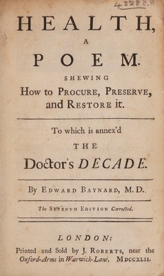Health, a poem. Shewing how to procure, preserve, and restore it. To which is annex'd The Doctor's decade / By Edward Baynard, M. D.