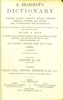B. Bradshaw's Dictionary of bathing places, climatic health resorts, mineral waters, sea baths, and hydropathic establishments : giving the names of doctors, hotels which can be recommended with confidence; and other useful information ...