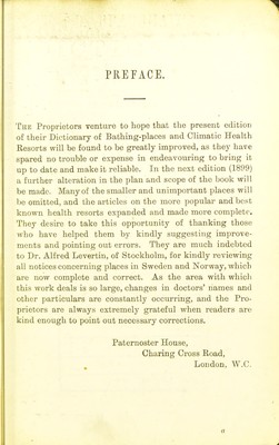 Credit: B. Bradshaw's Dictionary of bathing places, climatic health resorts, mineral waters, sea baths, and hydropathic establishments : giving the names of doctors, hotels which can be recommended with confidence; and other useful information ... Source: Wellcome Collection.