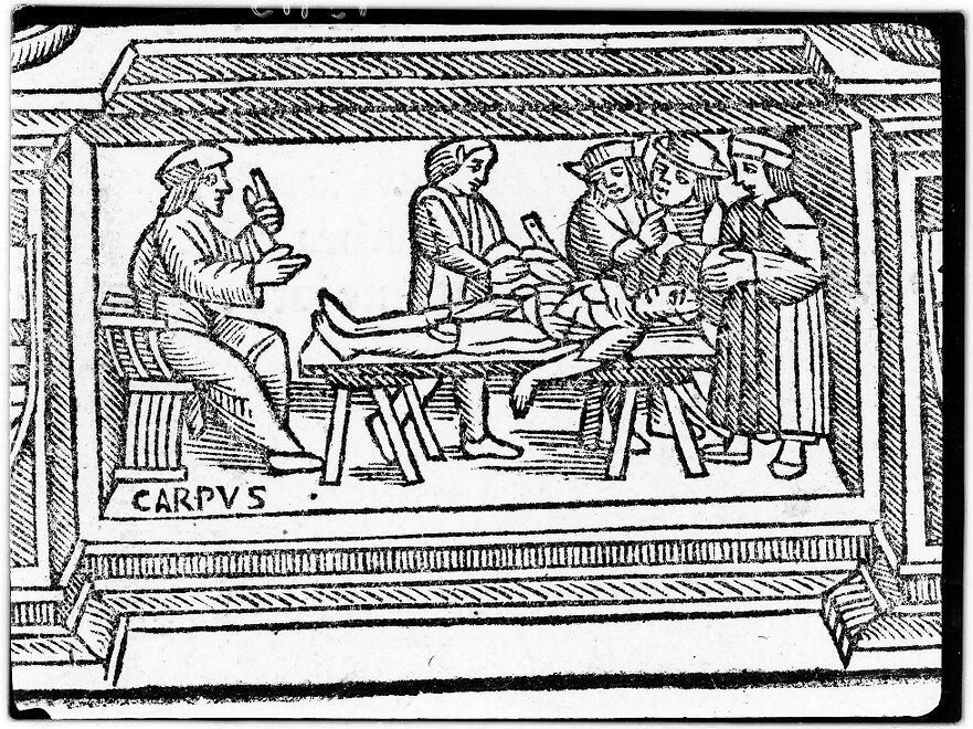 Credit: M0013913: Anatomical dissection by prosecutor with lecturer sitting apart, 1522. Source: Wellcome Collection.