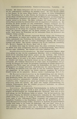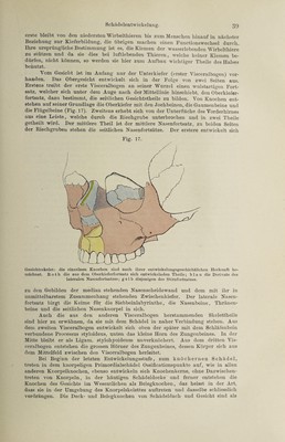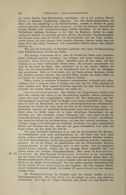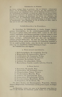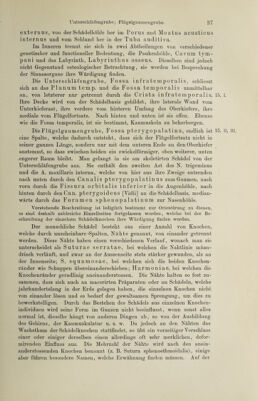![externus, von derSchädelhöhle lier im Torus und Meatus acusticus internus und vom Schlund her in der Tuba auditiva. Im Inneren trennt sie sich in zwei Abtheilungen von verschiedener genetischer und functioneller Bedeutung, die Paukenhöhle, Cavum tym- pani und das Labyrinth, Labyrinthus osseus. Dieselben sind jedoch nicht Gegenstand osteologischer Betrachtung, sie werden bei Besprechung der Sinnesorgane ihre Würdigung finden. Die Unterschläfengrube, Fossa infratemporalis, schliesst sich an das Planum temp. und die Fossa temporalis unmittelbar an, von letzterer nur getrennt durch die Crista infratemporalis. 15,1. Ihre Decke wird von der Schädelbasis gebildet, ihre laterale Wand vom Unterkieferast, ihre vordere vom hinteren Umfang des Oberkiefers, ihre mediale vom Flügelfortsatz. Nach hinten und unten ist sie offen. Ebenso wie die Fossa temporalis, ist sie bestimmt, Kaumuskeln zu beherbergen. Die Flügelgaumengrube, Fossa pterygopalatina, endlich ist 15, II, III. eine Spalte, welche dadurch entsteht, dass sich der Flügelfortsatz nicht in seiner ganzen Länge, sondern nur mit dem unteren Ende an den Oberkiefer anstemmt, so dass zwischen beiden ein zwickelförmiger, oben weiterer, unten .engerer Raum bleibt. Man gelangt in sie am skeletirten Schädel von der Unterschläfengrube aus. Sie enthält den zweiten Ast des N. trigeminus und die A. maxillaris interna, welche von hier aus ihre Zweige entsenden nach unten durch den Canalis pterygopalatinus zum Gaumen, nach vorn durch die Fissura orbitalis inferior in die Augenhöhle, nach hinten durch den Can. pterygoideus [Yidii] an die Schädelbasis, median- wärts durch das Fora men sphenopalatinum zur Nasenhöhle. Vorstehende Beschreibung ist lediglich bestimmt zur Orientirung zu dienen, es sind deshalb zahlreiche Einzelheiten fortgelassen worden, welche bei der Be¬ schreibung der einzelnen Schädelknochen ihre Würdigung finden werden. Der menschliche Schädel besteht aus einer Anzahl von Knochen, welche durch unscheinbare-Spalten, Nähte genannt, von einander getrennt werden. Diese Nähte haben einen verschiedenen Verlauf, wonach man sie unterscheidet als Suturae serratae, bei welchen die Nahtlinie mäan¬ drisch verläuft, und zwar an der Aussenseite stets stärker gewunden, als an der Innenseite; S. squamosae, bei welchen sich die beiden Knochen- ränder wie Schuppen Übereinanderschieben; Harmoniae, bei welchen die Knochenränder geradlinig aneinanderstossen. Die Nähte halten so fest zu¬ sammen, dass sich auch an macerirten Präparaten oder an Schädeln, welche jahrhundertelang in der Erde gelegen haben, die einzelnen Knochen nicht von einander lösen und es bedarf der gewaltsamen Sprengung, um dies zu bewerkstelligen. Durch das Bestehen des Schädels aus einzelnen Knochen¬ individuen wird seine Form im Ganzen nicht beeinflusst, wenn sonst alles normal ist, dieselbe hängt von anderen Dingen ab, so von der Ausbildung des Gehirns, der Kaumuskulatur u. s. w. Da jedoch an den Nähten das Wachsthum der Schädelknochen stattfindet, so übt ein vorzeitiger Verschluss einer oder einiger derselben einen allerdings oft sehr merklichen, defor- mirenden Einfluss aus. Die Mehrzahl der Nähte wird nach den anein- anderstossenden Knochen benannt (z. B. Sutura sphenoethmoidalis), einige aber führen besondere Namen, welche Erwähnung finden müssen. Auf der](https://iiif.wellcomecollection.org/image/b31363350_0001_0055.jp2/full/800%2C/0/default.jpg)
