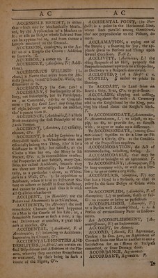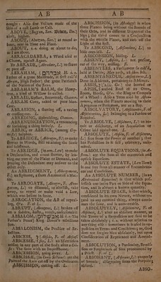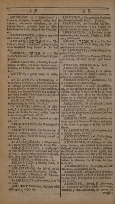 ![<u AB “ ; F a ABDUCTOR minimi dizgitt, \in Anat.) a Mufcle which draws the little Finger ftom the reft, ABDUCTOR Pollicis, 2 Mufcle of the rhumb which draws it from theFingers,L. ABDUCTOR oculi, a Mufcle that draws the Eye from the Nofe. L. ABDUCTOR minimi diciti pedis, a Muf- €le of the little Toe which draws it from ene felt; ES ' ABDUCTOR Pollicis pedisy.a Mufcle of the great Toe which draws it from the voit, I. “ABDUCTORES, [in Anatomy] Abducent Mufeles, are univerfally thofe that ferve to open or pull back divers Parts of she Body, as Arms, Legs, Eyes, (7c. I “\A-BEARING, Behaviour, as to be £0 a good Behaviour. L. F- ABECEDARY, belonging to the Letters A, B,C. is -ABECEDARIAN, which Teaches or Learns the A, B,C. ABECHED, [of Abbecher, ©. F.] fatisfied. . ABEDGE,, to Abide. Chaucer. . ABEL, [9T, H. i.e. Vanity] the Name of Adam’s fecond Son. . . ABELE-TREE., a fine kind of white Poplar. ABELINS, a fort of Chriftian Hereticks in Africa, who adopted Sons and Dangh- ters to inherit their Eftates leaving their Children by their Wives, as if they were illegitimate. ; ABENT, ftecp Place. O. ABERCONWEY, jof Quer, C. Br. A Mouth and {Powwey, 7. e.° the Mouth of the River Conley] a City in Caernar- wonfpire in Wales, once named Caerbaen ; Rebuile by King Edward the III. our of the Ruins of Caerbaen. . ABERDENE, [of @ber, C. Br. and Mot, i. ¢. the Mouth of the River Don or to Feed. Scotland. ' - ABERFRAW, [ef Aber, C.Br. A Mouth and fFrale, 9. d. the Mouth of the River Fiat | a Place in the Meof Anglefey. ~ ABERGEVENNY? [of @be?,C Br. A ABERGENNY 3 Mouth and Seven- HY] A City in Monmouth- fhire. -ABEREMURDRUM, fee Eberemurdum. _ABERRANCY, a Wandering or go- 7 ABERRATION, § ing out of the Way. \ ABESSED, Humbled, or taft down. O. _ Fe ABET, lof Be'can, Sax.] to encou- rage, incite, egg or fet on} to maintain, ABETMENT, «in Law) the AG of abet- ting, encouraging, or fettiog,on to com= mitany Crime, , ABETTER, 9 ..one that’ advifes, ‘eggs ABETTOR, § on, or affifts another in doing an unlawtul, A@ ; as of Murder, Treafon, Felony, €7c. -ABETTORS, (in Law) are fuch, as wathe Appeals ot Murder or Felony againtt Per- {Ons, in order to render them infamous. Matt [of Bayery F. to gape ABEYANCE, § ‘after. Signifies a Thing to be in pofeonly, and.not in aus Lands, Tenements, Goods, Cc. are faid to be in Abeyance, when they are only in ExpeGation or Underftanding, in the In- tendment or Confideration of the Law, and not in a@ual Poffeffion. To ABGREGATE, [ Algregatum, L.] to fend out from. the Flock; to feparate. , To ABHOR, [ Abhorrer, F. of Abhor- rere, L. ] to loath or hate. ABHORRENCE, ABHORRENGY, abhors or-loaths, Ky ae ABIAH, [MYAN, B. te. the Wi the Lond ste san ba Samuel the Prophet. ABIATHAR, [WIN BL 7. ¢. Exe cellent Father, or the Father of the Reme that isaverfe from, Son of Abimelech. ABIB, [ °“U8, H. i. ¢. a ripe Har of Corn] che firft Month in the Jewifh Ec- clefiaftical Year, which anfwerseommon- ly.to part of onr March and part of A- ril. 5 : To ABIDE [Abi8an, Sax.) to continues tarry or ftay 5 to, dwell or live ina places to fuffer or.endure. » 5; ABJECT, [ Abjectus, Le) caft away, mean bafe, vile. F. . An ABJECT, {a caft away] a Perfon of no Repute or Eficem. Le. * ABJECTION, > abje& Condition, low ABJECTNESS, § Eftate, meannefs, vile- ABIEZER, [ WWUYNAR A. 2. e. The Father’s Help] one “of King David’s 30 Champions. : ABIGAIL, {O°} H ie. The Father’s Joy} Nabal’s Wite, and afterwards King Davia’s. i ABIGEVUS, [for Abiceus} a. Thief who hath ftollen many Cattle, ET. The fame as Abaffor. gat ey a ABIMELECH, [ JOR A. ¢ 7. my Father the King] 2 King of Gerar. B2 ABING~ Lv af vay ee Pe](https://iiif.wellcomecollection.org/image/b30538798_0001_0025.jp2/full/800%2C/0/default.jpg)