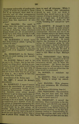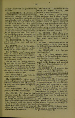 ![Dr. PEING-LE: I should suggest after desirable the insertion of the •words for the purpose 'of guiding the various Quarantine authorities. Dr. GEIEVE : Do you agree with it, Dr. Crane? Dr. CEANE : I think there should be some authentic statement as to the health of the country, to be published for information. Dr. GEIEVE : That is rather dif- ferent : we do publish here. Mr. SANDEESON: We have been getting lately fortnightly returns from the British Consul at Colon, and they have been of very great help to us. Dr. PEINGLE : I second the resolu- tion. Dr. BOWEN : I should like to know if it is to apply only to each colony which has sent delegates here ? Dr. GEIEVE : We are simply recom- mending what seems best to be done to ascertain the health of the colony. Dr. BOWEN: You would have to do more than notify the deaths that have occurred. It won't do to have a return of the deaths only. If, as in England, you had a system of notification of disease, it would be all right, but until these colonies have a system of notifying regularly the diseases existent over and above the mortality, what you are speak- ing about will be impossible. It won't show you the health of Demerara if she sends out a return showing you two deaths from yellow fever when besides that she might have had a dozen cases not proving fatal. Dr. GEIEVE : In England, death registration is always taken as the gauge of the public health. Their system is mainly dependent for its ground work upon the registrars' re- turns of deaths. I think every colony in the West Indies ought to have a system of registration of deaths. Where we have to deal with public health questions, this is of vital im- portance, because until we know what is killing the people, it is impossible to do a single thing in the prevention of disease. If a colony were to send nothing else besides the notification of deaths, still the monthly returns of mortality would be a great guide as to the health of the colony, and help us in our quarantine and preventive measures. Dr, CEANE : I am not at all sure that the registration of deaths can be taken as a reliable indication of the health of a colony. We have a system in Trinidad, but its defect is that it permits any person to inform of the death, and in some districts there may be a dozen persons giving information so that one death may be recorded as a dozen deaths and from a dozen differ- ent diseases. That is owing to the imperfect system of registration, and there being no proper medical certificate. Mr. BEEKELEY : In our case it is the doctor. Mr. low : Are we not drifting into the question of the necessity of registra- tion in the colonies, instead of quarantine only ? I think we are drifting into questions of sanitation, which must be local matters. The PEESIDENT : The question is the interchange of information between the colonies. Dr. PEINGLE : I may say that so advanced is the colony of Jamaica in these matters that we have both regis- tration of deaths and notification of disease. Eesolution, as amended, carried. [See Minutes, Fifth Sitting. Page 74.] Mr. BEEKELEY: I would ask the delegates, what do they intend ? At the present moment, suppose one colony represented here declared a place an infected place, what do hon. mem- bers suppose will follow ? Will it be necessary for every other colony to do the same ? At present we have not arrived at that. Is this Conference pre- pared to recommend that became one colony declares a place an infected place it is incumbent on the other colonies to do so likewise ? The PEESIDENT : If we quaran- tine Martinique and Barbados does not, we must quarantine Barbados, I think. Mr. BEEKELEY : That has been the practice ; but don't you think it is desirable for us to come to some expres- sion of opinion on that point ?](https://iiif.wellcomecollection.org/image/b21297678_0198.jp2/full/800%2C/0/default.jpg)