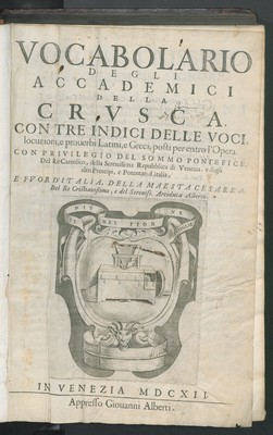 Credit: Vocabolario degli Accademici della Crusca, con tre indici delle voci, locuzioni, e proverbi latini, e greci, posti per entro l'opera. Source: Wellcome Collection.
