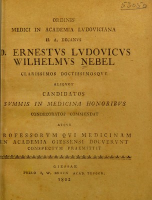 Ordinis medici ... decanus ... aliquot candidatos summis in medicina honoribus condecoratos commendat atque professorum qui medicinam in Academia Giessensi docuerunt conspectum praemittit. [Cum vitis candidatorum] / [Ernst Ludwig Wilhelm Nebel].