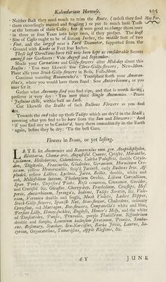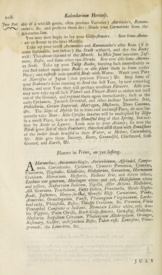 ![June Par. l/YNJ Kalendarintn Hortenfe. dils of a whitilh green, often produce Varieties) Auricula's, Ranun¬ culus's,, &c. and preferve them dry: Shade your Carnations from the AfYou°may now begin to lay your Gilly-flowers. • Sow fomeA» • als to flower in the later Months. Take up your rareft Anemonies and Ranunculus s alter Rain (it it. come feafonable, not before) the Stalk wither’d and dry the Roots weU • This about the end of the Month. In Mid -June inoculate jaj- mine Rofes, and feme other rare Shrubs. Sow now alio fomz Auemo- m Seeds, fake up your Tulip Bulbs, burying fuch immediately as you find naked upon your Beds; or elfe plant them in feme cooler Place • and refrejh over-patch’d Beds with Water, Water youi Tots of Narcijfus of Japan (that precious Flower) be. Stop fome.of your Scabious's from running to Seed the firft Year, by now removing them and next Year they will produce excellent Flowers Alio you may now take up all fuch ‘Plants and Flower-Roots as endure not well out of the Ground, and replant them again immediately; iuch as the earlv Cyclamen, Jacinth Oriental, and other bulbous Jacinths, Ins, Frliilaria, Crown Imperial, Martagon, Mufcaris Hens Canmus, &c The Slips of Myrtle fet in fome cool and moijl Place, do now le- ciuently take Root: Alfo Cytifus lunatus will be multiplied by Slips hr a moift Place, fuch as are an Handful long of that Spring, but nei¬ ther by Seeds or Layers. Look now to your Aviary; for itow the Birds grow fick of their Feathers; therefore affift them vnthEmulfans of thecooler Seeds bruifedin their Water, as Melons Cucumbers, be. Alfo give them Succory, Beets, Groundfel, Chickweed, fidh Gravel, artd Earth, &c. Flowers in Frimey or yet la fling. AMaranthus, Anemonies fingle, Antirrhinum Afphodel, Campa¬ nula, Convolvolus, Cyclamen, Clematis Pammca, Cyannus, -aria ‘Dhitalis, Gladiolus, Hedyfarum, Geranium, Hormmum Creticim] Huracium, Hefperis, Bulbous Iris and divers others. Lychnis var generum, Martagon white and red, Millefolium white and yellow, Nafturtium Indicum, figella, After Atticus Hgtb.°Z' Alb. Gentiana, Trachelium, Ficus Indtca, Fraxmella, Shrub Night- (hade Jafmines, Honey-fucktes, Genifta Hifp. Carnations, Tin s, Armerius, Ornithogahm, Tanfy, Tbalangium Virgmiamm, Larks- heel early, Thilofella, Rofes, Thlafpi Creticum &c. r'f.romcaftVg f ‘Pentaphyl Campions or Sultans, Mountain Lillies whi e, re , - ble Poppies Talm Cbrifti, Stock-Gilly-ftowers, Corn-flag, Hollyhoc, Mufcaria, Serpillum Citratum, Thalangiim Allobro^hFs^poFZ Rofemary, Gelder, -m&Cynomon Rofes, Tuber-rofe, Lentifcus, Ro,,e granade, the Lime-tree, Stc. JULY](https://iiif.wellcomecollection.org/image/b30416103_0588.jp2/full/800%2C/0/default.jpg)