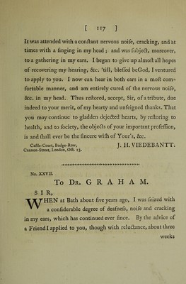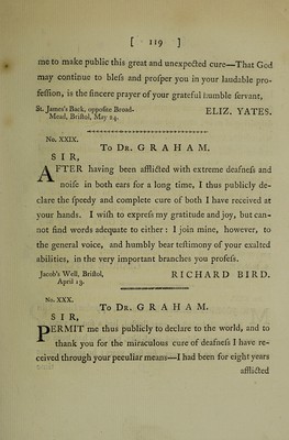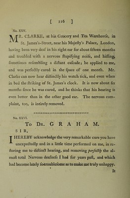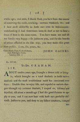 ![generaY state O F Medical and Chirurgical PRACTICE, ANCIENT and MODERN, EXHIBITED; A i < : S HEW IN G THEM TO BE Inadequate, Ineffectual, Abfiird, and Ridiculous, )p .1 ’ PARTICULARLY IN ' •i. Confumptions, Afgimas, Nervous, Gouty, BiliouS) S.cori)ii tifc,r ?Sift6f>Hulous:, • Rheumatic,' and in many-other Diforders, external as well as internal; aY ' A N D More rational, elegant, fpeedy, effe&ual, and lading Methods . ot Cure, by Means of Diet, Ample Medicines, Aerial, JEtherial, Magnetic, and Eledtric Influences, Effluvia, Medicines, Baths, Vapours, and Applications,—recommended. T-O WHICH ARE ADDED, A great Number of recent and remarkable Cases and Cures, never before publifhed. By JAMES G R A H A M, M. D. “ EUOl S'e TO U6V TL TO)V U'/]' hjQVJUSVOOV £^ei)Pi<TK£iV, 0, Tl, XCU £Vp&£V , ‘t\ y y / /’ 1 a / / \ v v Kpecrcrov v) ave^ii^stov, fcvvsTtog ooxesi £7nUuluv}f6'% rs x&i epyov eivou. Hippocratis de Arte. Rationalem quidem puto Medicinara effe debere; inffrui vero ab evidentibus caulis. Cels us. BAT H: Printed by R. Cruttwell, and fold by all the B^okfellers in Lon.lg% Edinburgh, Bath, and Briilol. 1778.](https://iiif.wellcomecollection.org/image/b30791571_0001.jp2/full/800%2C/0/default.jpg)
