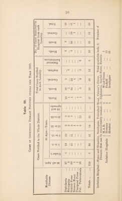 ![Table V. Infantile Mortality derusts the Year 1909. Deaths from stated Causes in Weeks and Months under One Year of Age. I CAUSE OF DEATH. All Causes— Certified... Uncertified 5: Common Infectious Diseases— Small-pox Chicken-pox Measles ... Scarlet Fever ... Diphtheria. Croup Whooping Cough Diarrhoeal Diseases— Diarrhoea, all forms Enteritis... Gastritis, Gastro-intestinal Catarrh Wasting Diseases—- Premature Birth Congenital Defects Injury at Birth Want of Breast Milk, St’v’tion Atrophy, Debility, Marasmus Tuberculous Diseases— Tuberculous Meningitis Tuberculous Peritonitis : Tabes Mesenterica Other Tuberculous Diseases Erysipelas Syphilis ... Packets ... ... ... Meningitis (not Tuberculous) Convulsions Bronchitis Laryngitis Pneumonia Suffocation, overlaying... Other Causes 1 C/3 m • . in _ ] X rH . . in cf. 'SI m in in in X 4-3 443 2 o in cn C/2 J-l r-1 p X x rH X r~| 4-3 (—> r~ -P XI X 24 +3 4-3 4-3 4-3 4-3 4-3 433 4-=> O o c 43 |XH Cl) 03 <D ■p P P *2 p C H Q P o rH CD CD <X> Ej o o o o 0 6 o o rH r; 03 ~ £ £ p *H rH r- £ rH £ £ rH CM o <—1 CO 1 co =3 X p ^ CM co rH X) CO C- 1 oc 05 1 r-H o 1 rH 5 S3 O X rH CN CO' H rH r—1 ca CO rH o CO r~ GO 05 rH rH rH P P 1 2 8 1 3 1 1 5 3 1 5 1 29 U I 8 | 1 3 1 1 1 1 3 2 4 2 4 1 2 2 3 2 29 Populat'on (estimated to middle of 1909) Births in the Year j ( illegitimate -I-, j-i . 11 tr , f legitimate infants Deaths m the Tear of *,? ... , ( illegitimate ,, Deaths from all Causes at all Ages ... 11,005. 315 6 29 0 100.](https://iiif.wellcomecollection.org/image/b30431190_0030.jp2/full/800%2C/0/default.jpg)