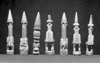 M0019325EC: Seven carved wood statues representing Oma, a household god: rear view. Attribution 4.0 International (CC BY 4.0). Source: Wellcome Collection.