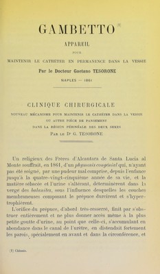 Gambetto : appareil pour maintenir le cathéter en permanence dans la vessie / par Gaetano Tesorone.