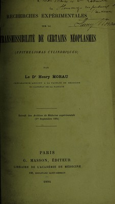 Recherches expérimentales sur la transmissibilité de certains néoplasmes (epitheliomas cylindriques) / Henry Morau.