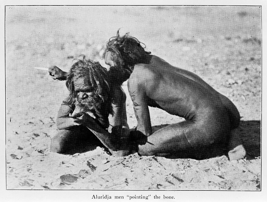 Credit: M0012311: Kurdaitcha using a pointing bone, Australia. Source: Wellcome Collection.