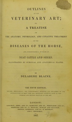 Outlines of the veterinary art, or, A treatise on the anatomy, physiology, and curative treatment of the diseases of the horse ; and subordinately, of those of neat cattle and sheep : illustrated by surgical and anatomical plates / Delabere Blaine.