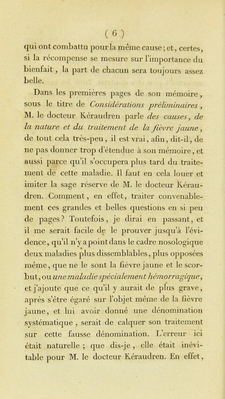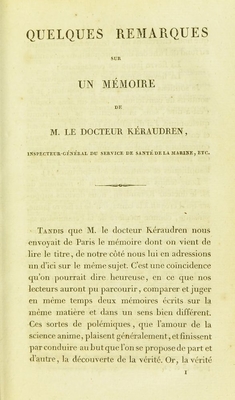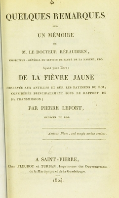 Quelques remarques sur un mémoire de M. le docteur Kéraudren ... ayant pour titre, De la fièvre jaune observée aux Antilles et sur les bâtimens du Roi, considérée principalement sous le rapport de sa transmission / par Pierre Lefort.